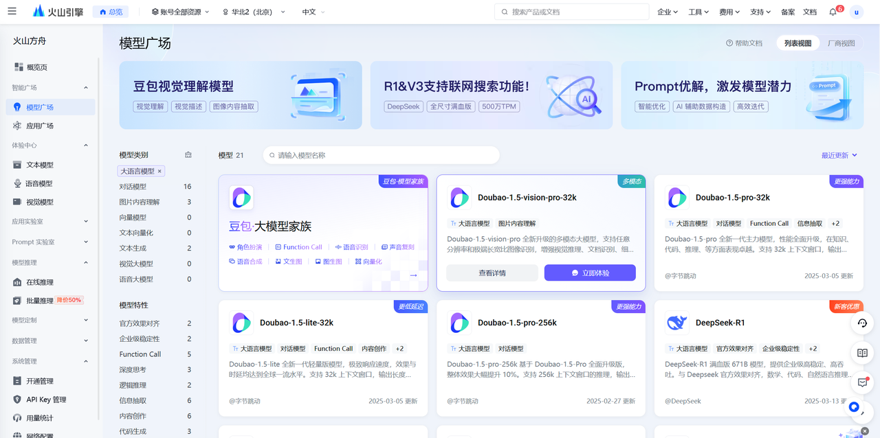 先回到模型广场,选择自己要使用的大模型。大家如果不知道该选什么模型,可以先看看模型的种类,如下图所示。