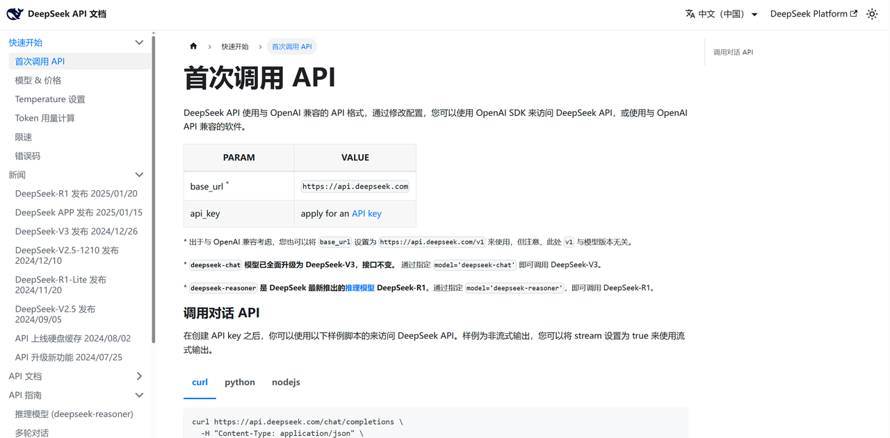 deepseek官网:https://api-docs.deepseek.com/zh-cn/