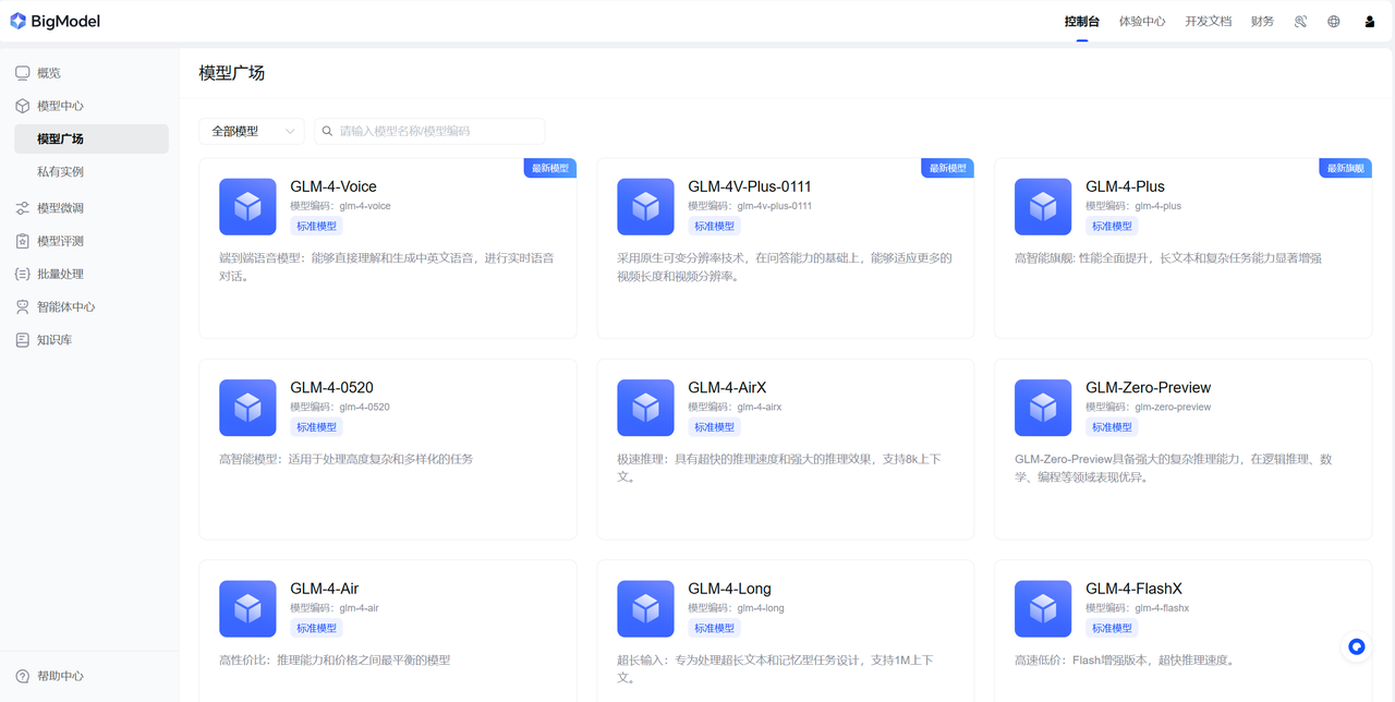智谱AI开放平台:https://open.bigmodel.cn/console/modelcenter/square