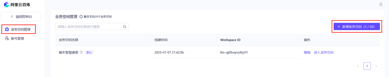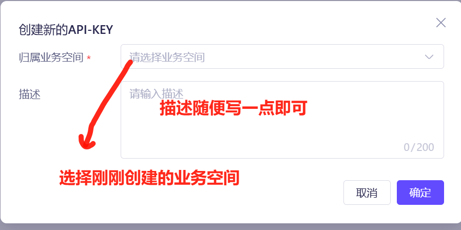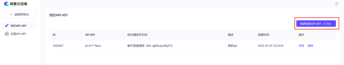 创建工作空间时随便写一个名字就可以了,主要是下面创建APIkey需要选一个工作空间。接下来,返回控制台,再点击头像,点击API-KEY,进入API-Key的列表。点击”创建我的API KEY“。