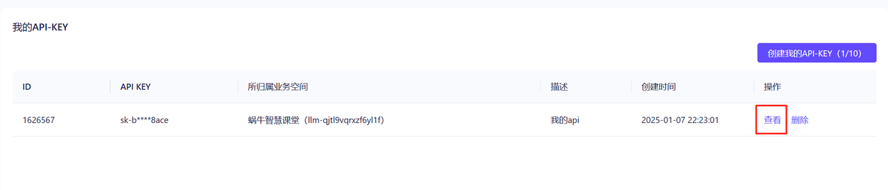 点击确定后,就可以在API key列表中看到刚刚创建的API key。然后点击查看按钮,可以复制这个API key
