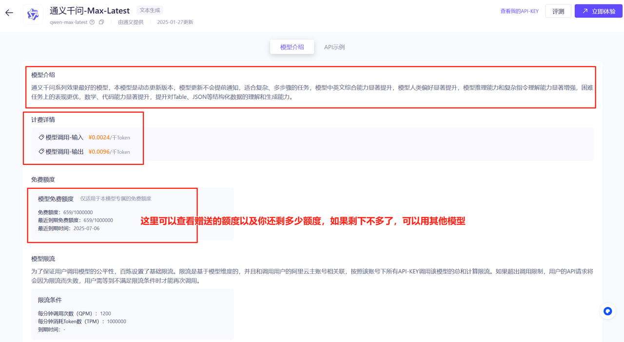 选定模型后,比如我想调用通义千问-Max-Latest这个模型,就在模型广场找到它,点击查看详情按钮。接下来,就会出现模型的介绍和赠送的token使用量等信息。