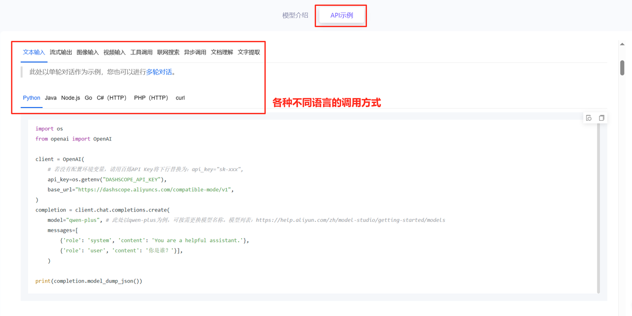 如果要看API怎么调,可以点击旁边的API示例。往下拉,可以看到下面这个内容。