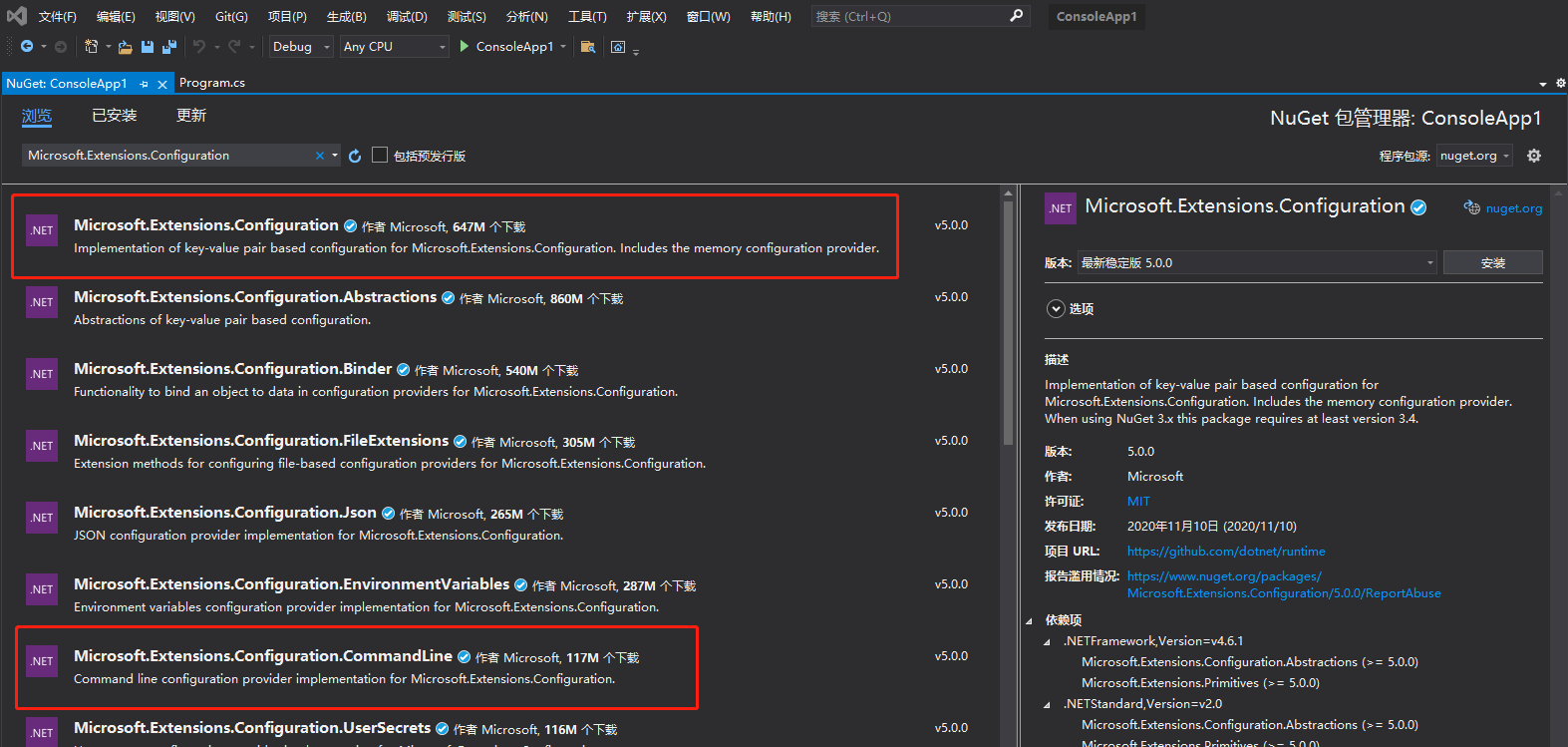 在搜索栏中搜索 Microsoft.Extensions.Configuration 和 Microsoft.Extensions.Configuration.CommandLine 并安装,中间有个提示是否接受的提示框,选择接受即可。