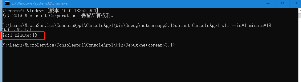 然后生成,到目录文件下去,cmd,输入dotnet ConsoleApp1.dll --id=1 minute=18,回车运行: