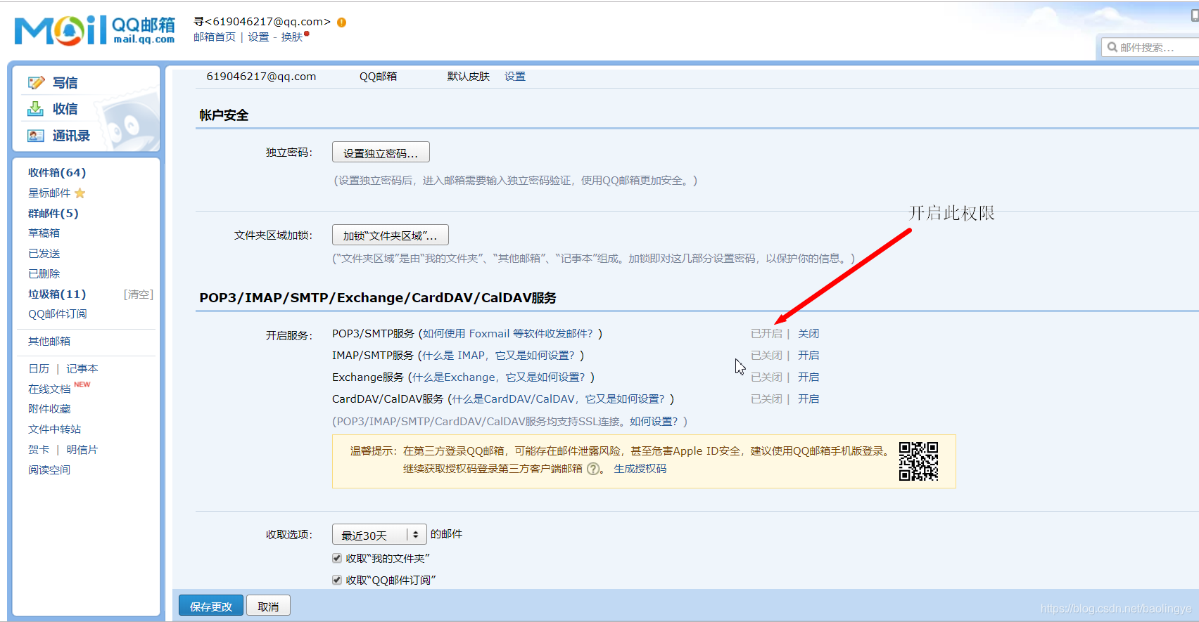 QQ邮箱–>邮箱设置–>账户–>POP3/IMAP/SMTP/Exchange/CardDAV/CalDAV服务 开启POP3/SMTP服务,然后获取16位授权码(注意不要将授权码泄露,一个账户可以拥有多个授权码)