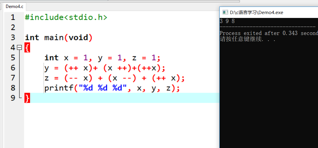 按照正常的运算逻辑,y=2+2+4=8,z=3+3+3=9,x的最终值为3!