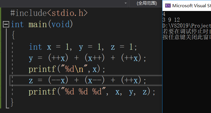 int main(void) { int x = 1, y = 1, z = 1; y = (++ x) + (x ++) + (++ x); z = (-- x) + (x --) + (++ x); printf("%d %d %d", x, y, z); }