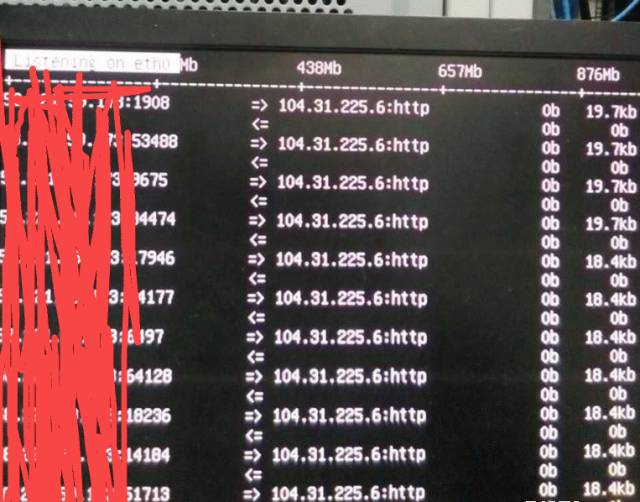 机房技术给我拍了照,看到本地一直通过 http 方式向 104.31.225.6 这个 ip 发送数据包,而且持续不断。