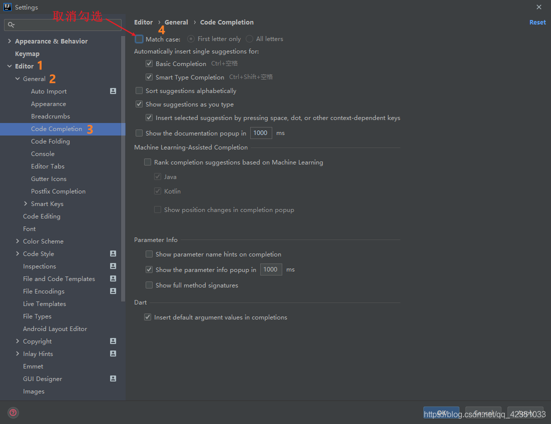 第二步:点击 Editor(编辑) → General(常规) → Code Completion(代码补全),取消勾选 Match case(区分大小写) 选项,最后点击 Apply 即可。