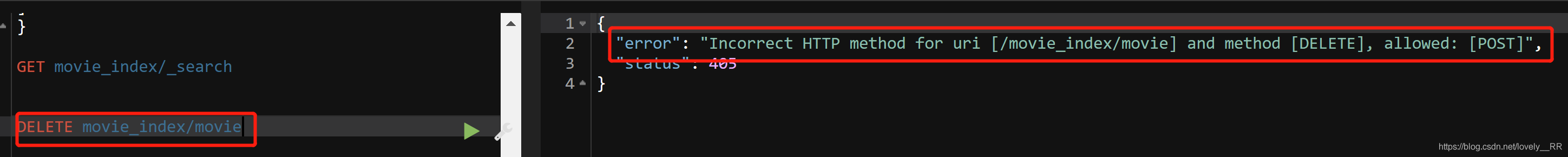 测试完成之后我们的确可以看到id为2的数据已经被删除了,能够删除数据.这里还有一个注意点就是ElasticSearch5.0的版本以后就 不再支持删除单个type了 ,如果去执行该命令的话,我们会看到会报下面的错误