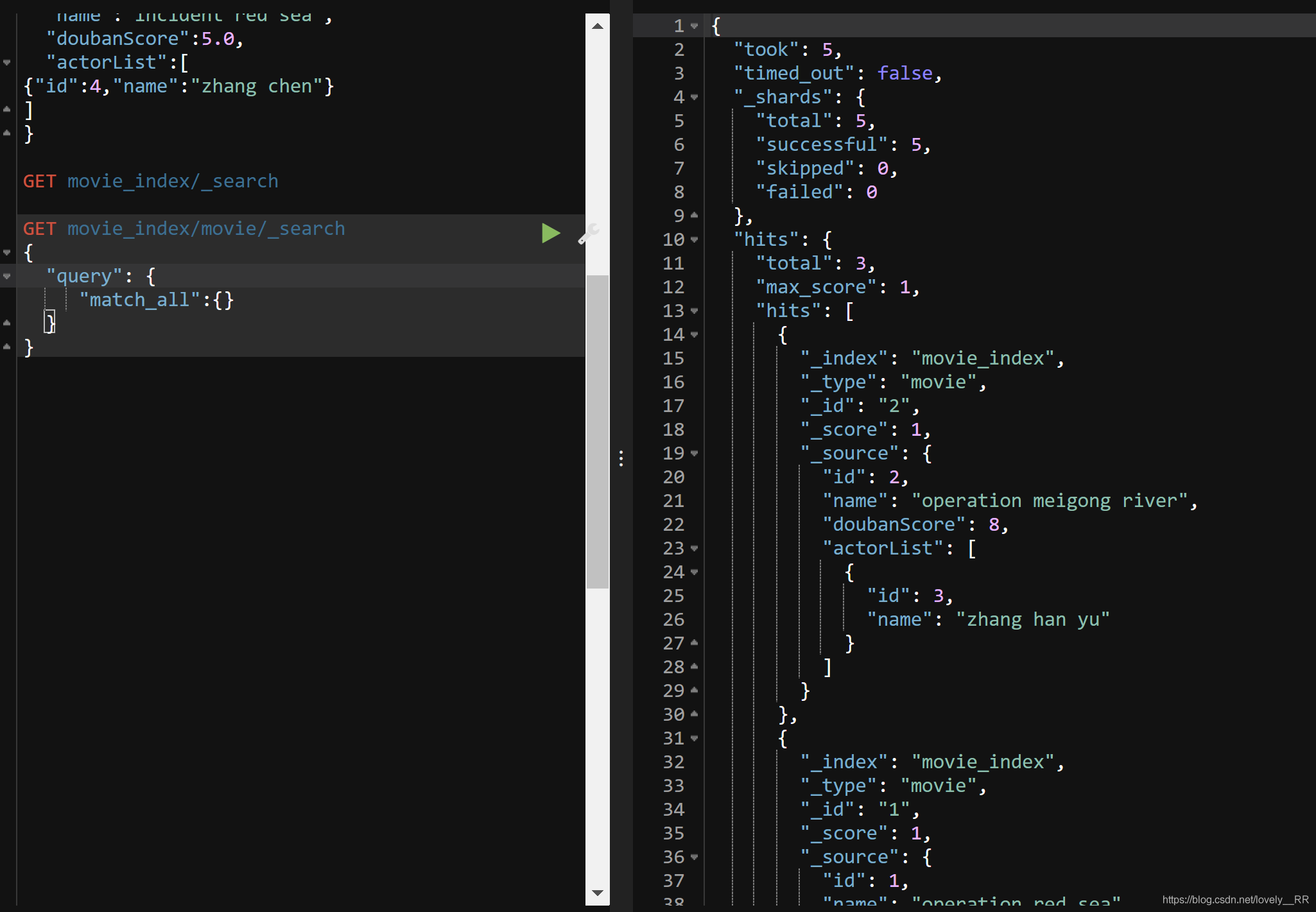 这里的"query"就代表我们的删除条件,整段代码的意思就是删除movie_index索引节点下movie这个type里面name里面有red关键字的所有记录.这里我们执行来看看.