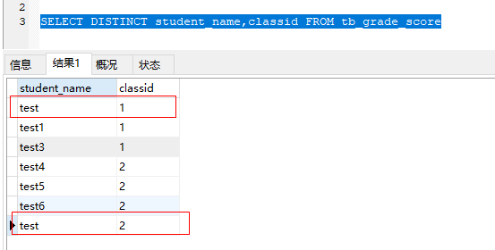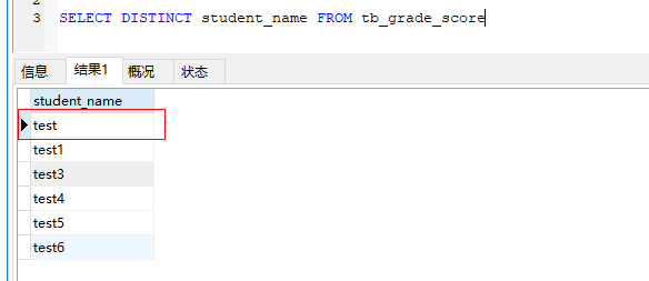首先,单个字段 -》用distinct对student_name 进行筛选,单个字段查询的话,可以看到已经将一个重复的test学生记录去掉了