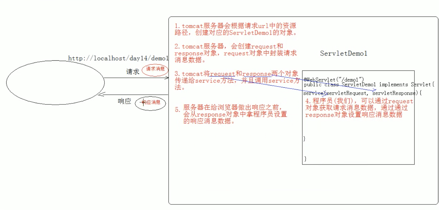(1)请求进入tomcat中,tomcat服务器会根据请求url中的资源路径,创建对应的servletdemo对象。