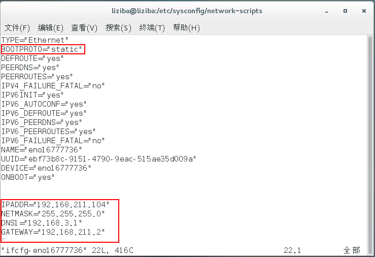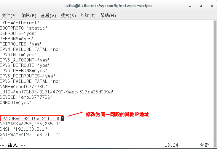 很多朋友都是使用的自动网络配置,可能这里不会修改,但是我这里用来搭建集群环境,需要固定IP,所以我配置了固定的静态IP,所以这里需要修改IPADDR