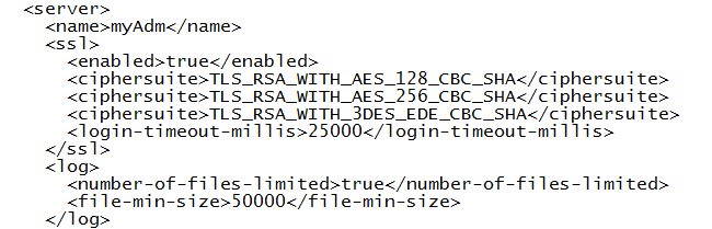 编缉$DOMAIN_HOME/config目录下的config.xml,找到要限制密码套件的server下的ssl标签(比如我这里是myAdm),加入以下内容: