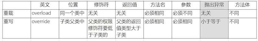 重写:发生在父子类中,方法名称、参数列表必须相同,返回值范围小于等于父类,抛出的异常范围小于等于父类,访问修饰符范围大于等于父类,如果父类方法访问修饰符为private则子类就不能重写该方法。