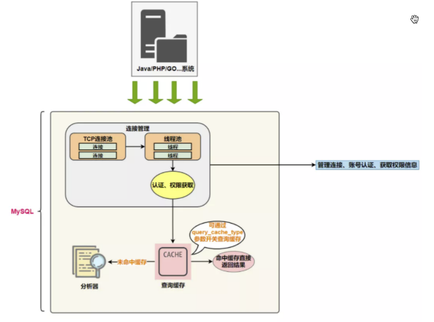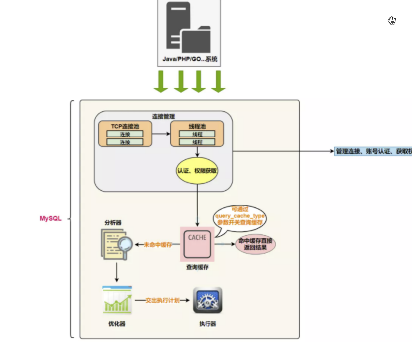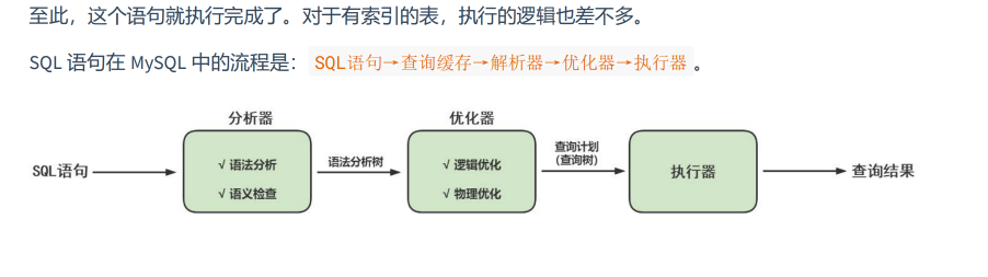 1.查询缓存:server如果再查询缓存中发现了这条sql语句,就会直接将结果返回给客户端;如果没有,就进入到解析器阶段。需要说明的是,因为查询缓存往往效率不高,所以在mysql8.0以后就抛弃了这个功能。