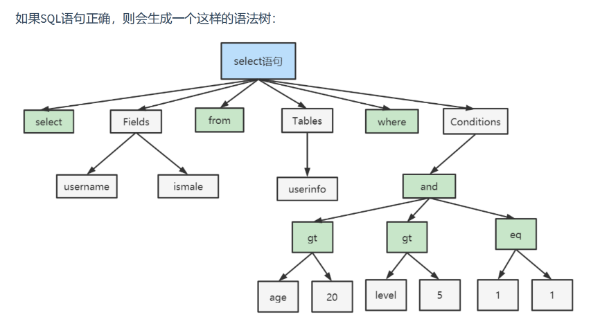 语法分析:根据词法分析的结果,语法分析器(比如:Bison)会根据语法规则,判断你输入的这个 SQL 语句是否 满足 MySQL 语法 。