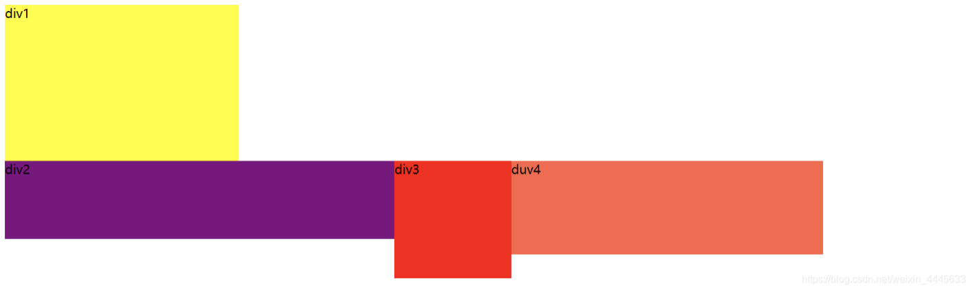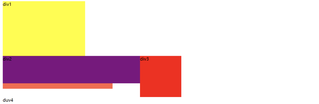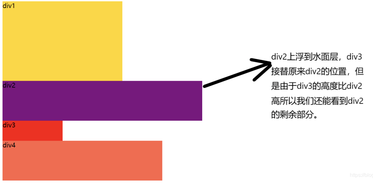 div2,div3浮动过后都上升到了水面层并排成一排了。同理div3浮动过后,div4就会接替原来div3的位置进行补充,组成重新的标准流。