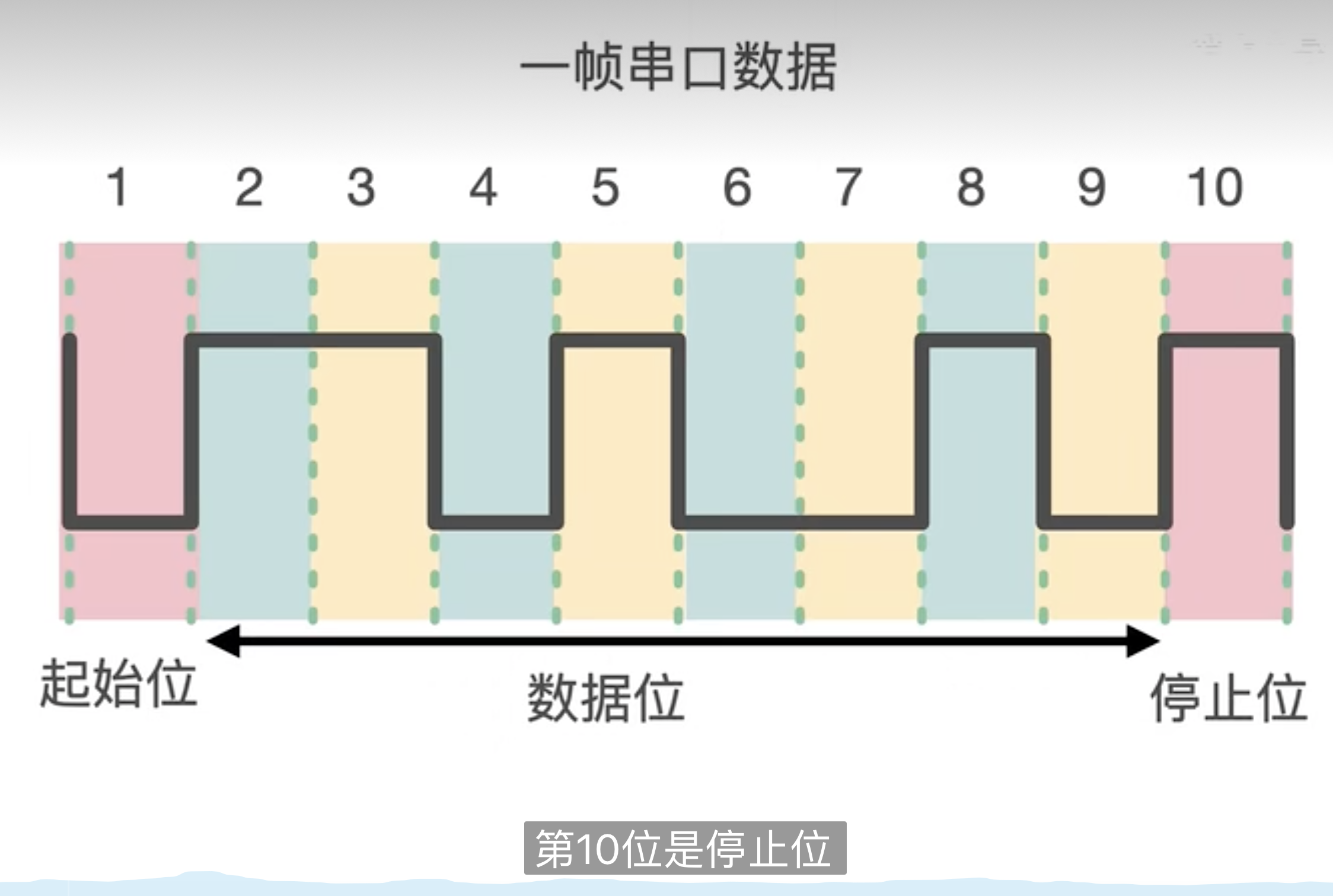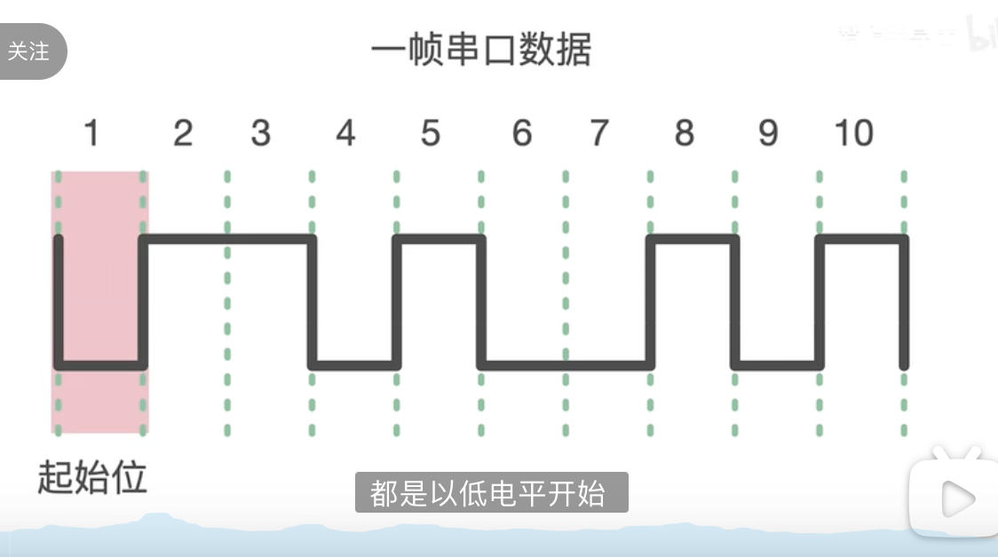 以低电平开始,中间8个,一个字节用来保存数据,最后一个是停止位(高电平)。