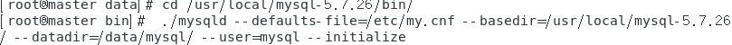 ./mysqld --defaults-file=/etc/my.cnf --basedir=/usr/local/mysql-5.7.26/ --datadir=/data/mysql/ --user=mysql --initialize
