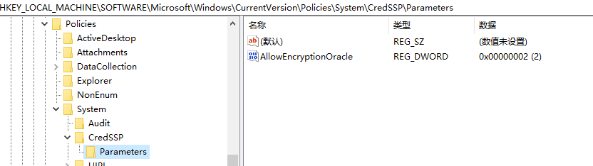 运行 regedit,打开注册表,HKEY_LOCAL_MACHINE\SOFTWARE\Microsoft\Windows\CurrentVersion\Policies\System\CredSSP\Parameters在 System(之后没有的文件夹,需自己创建