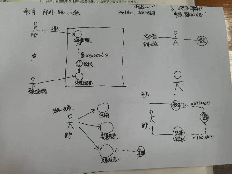 在学习了面向对象法后,经过课堂练习,对于小组的项目V—like交友小程序进行了用例建模分析,得到了初步的用例图,如下: