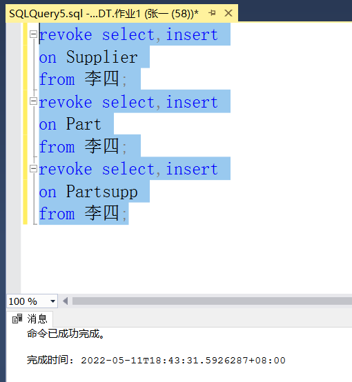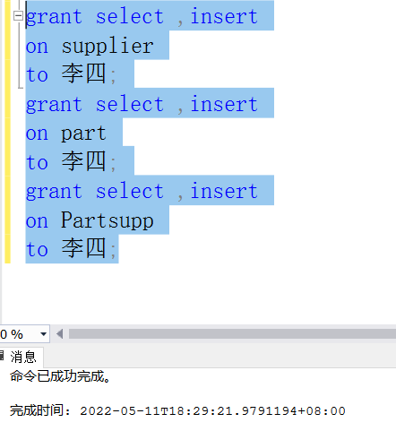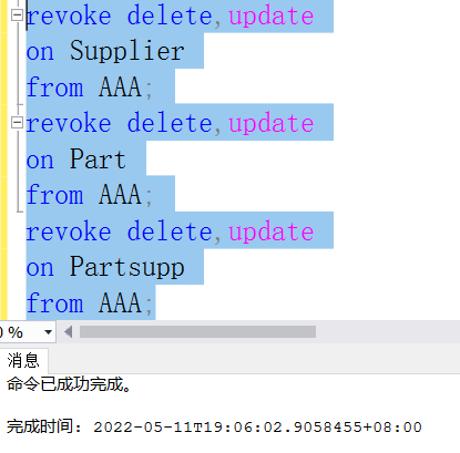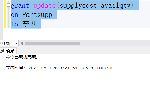 - 根据书上的例子,针对TPCH数据库模式设计各种权限管理语句,每种类型权限语句至少要设计一个,描述清楚权限要求,运行你所设计的权限语句,并截图相应的实验结果,每幅截图并要有较为详细的描述。也可以按照附1所列示例做实验。