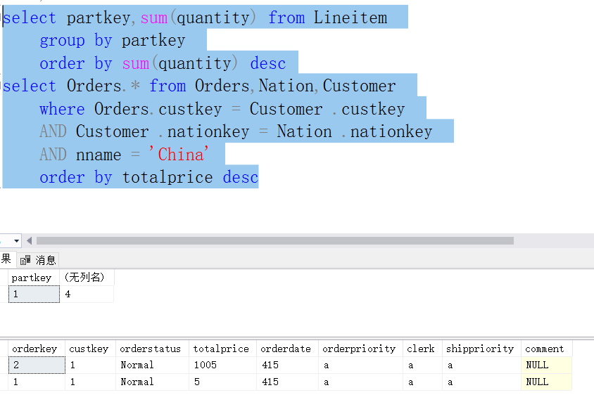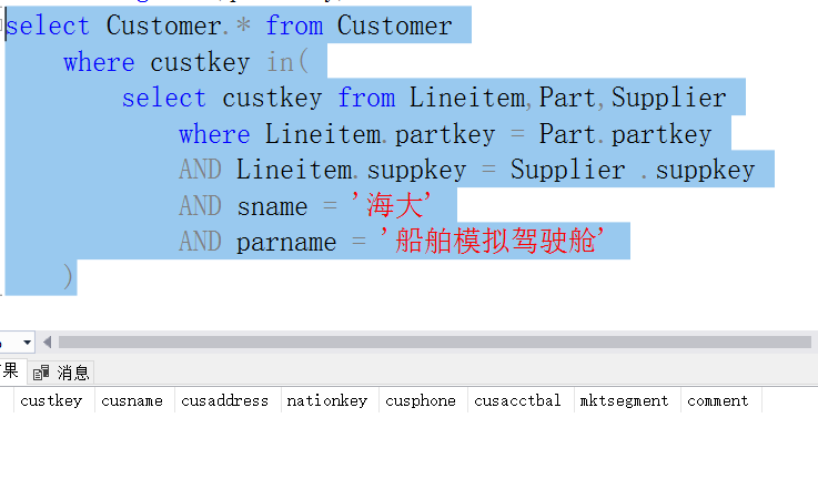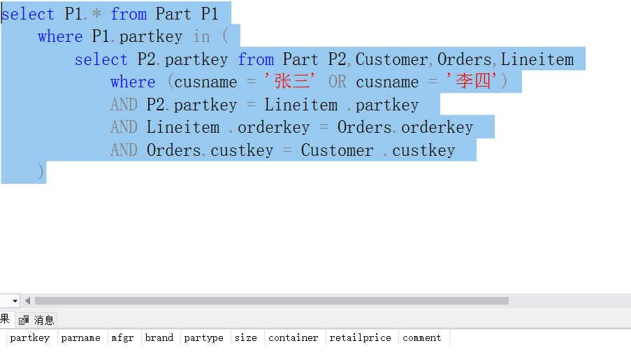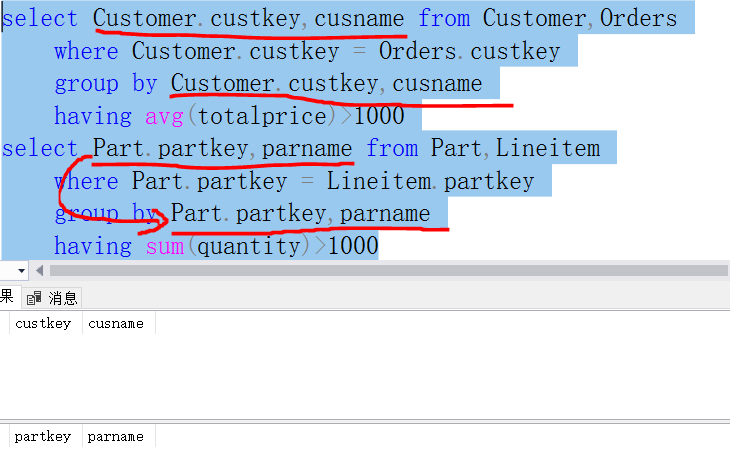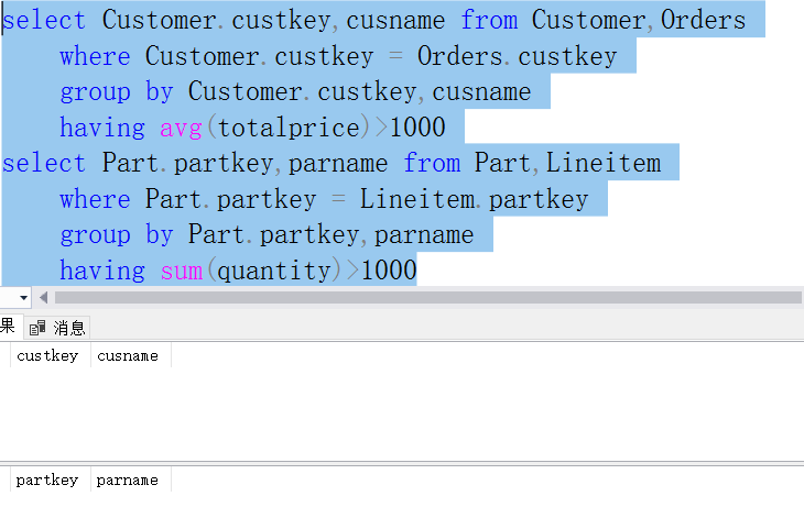 - 根据书上的例子,针对TPCH数据库模式设计分组统计查询、嵌套查询(IN、EXISTS)语句和集合查询语句,每种类型的基本查询至少要设计一个查询,描述清楚查询要求,运行你所设计的查询语句,并截图相应的实验结果,每幅截图并要有较为详细的描述。也可以按照附2所列示例查询做实验。