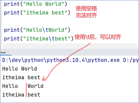 在字符串中,有一个特殊符号:\t,效果等同于在键盘上按下:tab键。