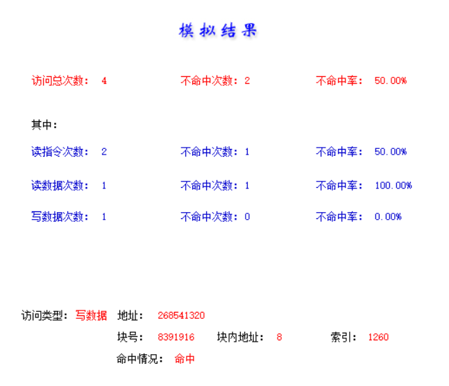 2)按默认设置,即:统一Cache(容量64KB),块大小32B,相联度为1(即直接映像),替换策略LRU,不预取,写回法,写不命中时按写分配。