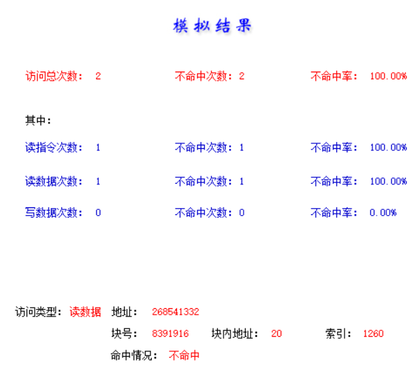 2)选择不同的Cache容量,分别2KB、4KB、8KB、16KB、32KB、64KB、128KB、256KB。分别执行模拟器(点“执行到底”按钮),自己列表记录各种情况下的不命中率。
