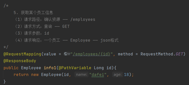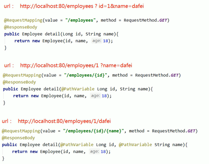 @RequestMapping(value = "/employees/{id}/{name}/{age}", method = RequestMethod.GET)