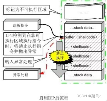 NX即No-eXecute(不可执行),NX的基本原理是将数据所在内存页标识为不可执行,当程序溢出成功转入shellcode时,程序会尝试在数据页面上执行指令,此时CPU就会抛出异常,而不是去执行恶意指令。