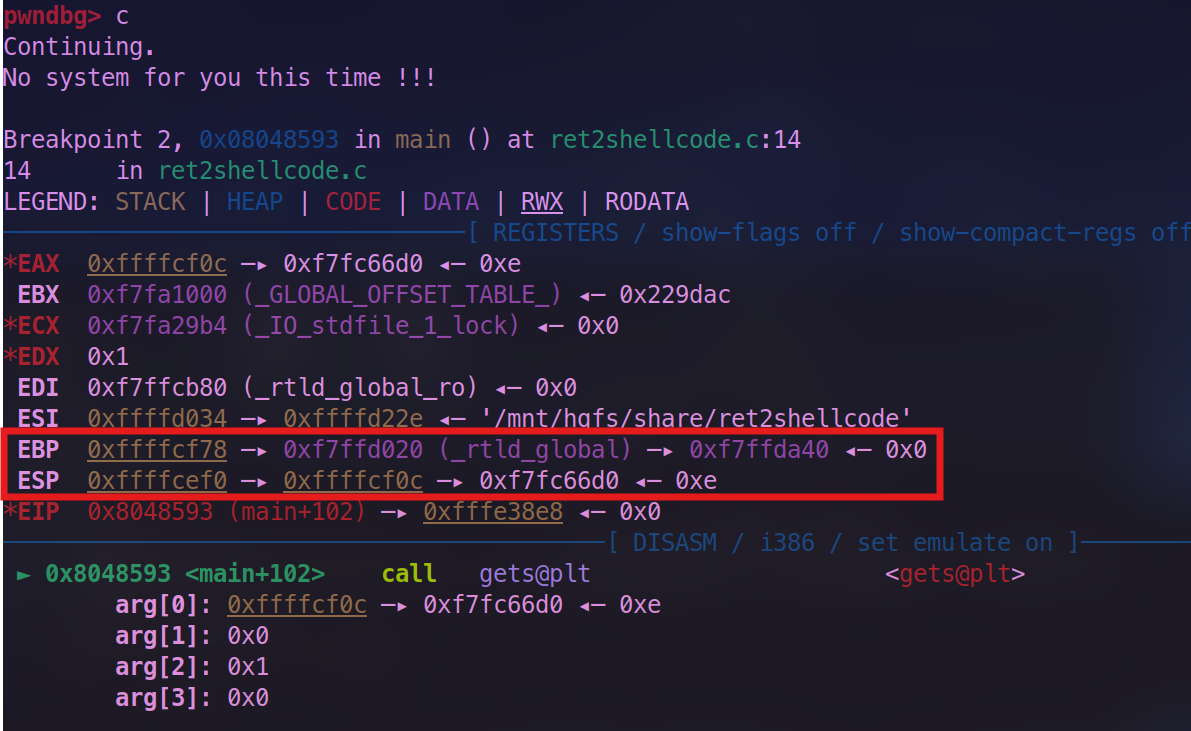 *ESI 0xffffd034 —▸ 0xffffd22e ◂— '/mnt/hgfs/share/ret2shellcode'