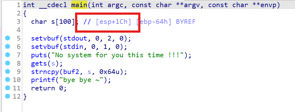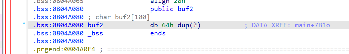 可以看出,程序仍然是基本的栈溢出漏洞,不过这次还同时将对应的字符串复制到 buf2 处。简单查看可知 buf2 在 bss 段。