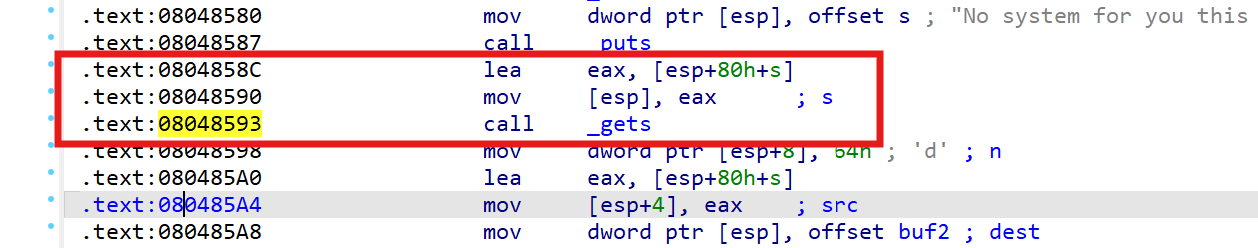 从下图看到,程序即将执行gets函数时,寄存器的状态。
