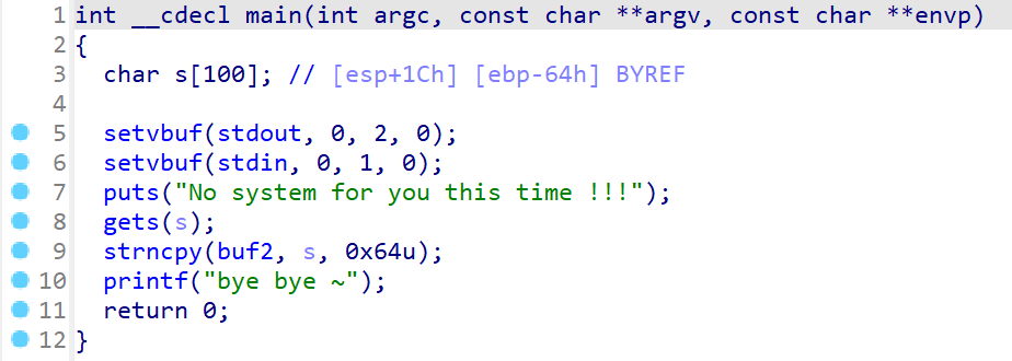 (思路:如果可执行,在gets函数获取自己编写的shellcode放入栈上的s处,顺便一直覆盖到返回地址,将main的返回地址覆盖成buf2的内存地址处。然后strncpy会将s处的shellcode放入buf2,在main返回时跳到buf2处执行shellcode。)
