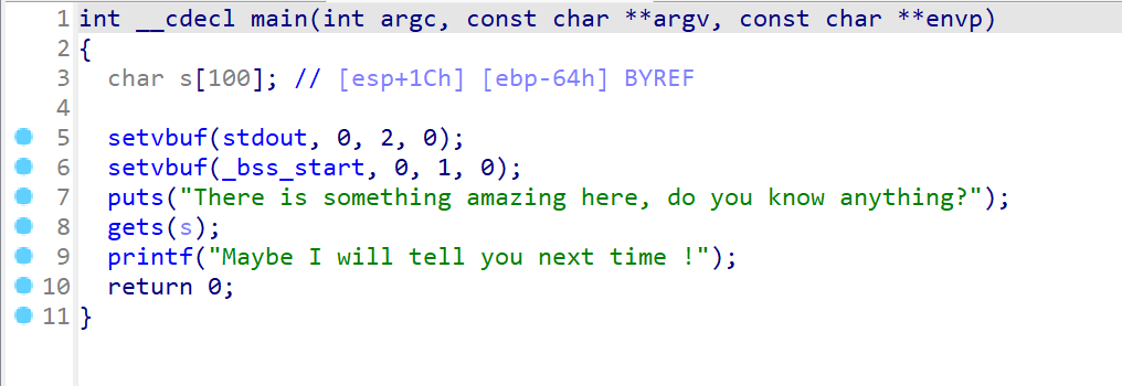 可以看出源程序几乎没有开启任何保护,并且有可读,可写,可执行段。接下来我们再使用 IDA 对程序进行反编译: