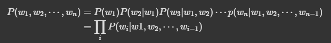 给定一句由 n 个词组成的句子 W=w1,w2,⋯,wn,计算这个句子的概率 P(w1,w2,⋯,wn) 的公式如下(条件概率乘法公式的推广,链式法则):