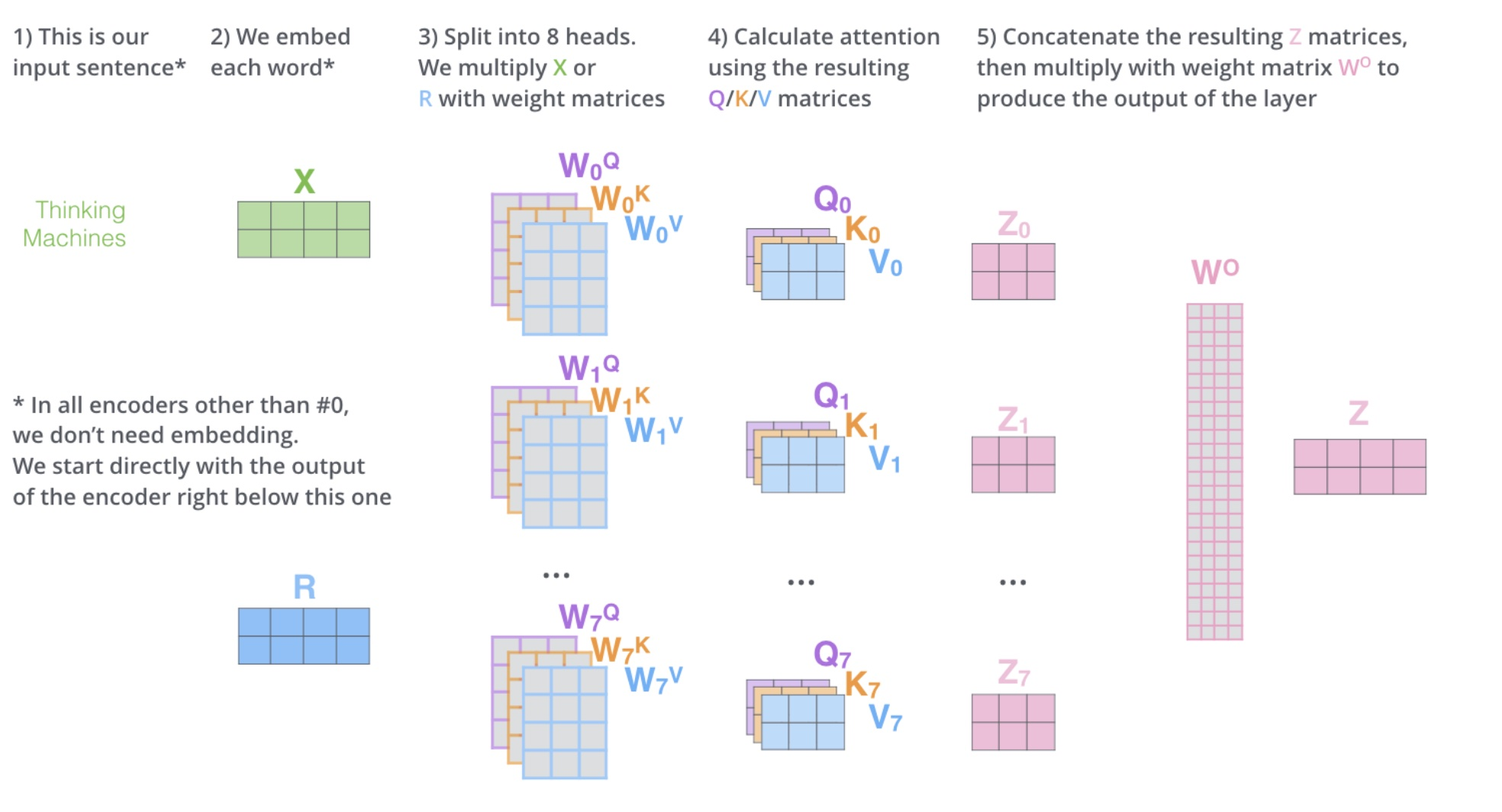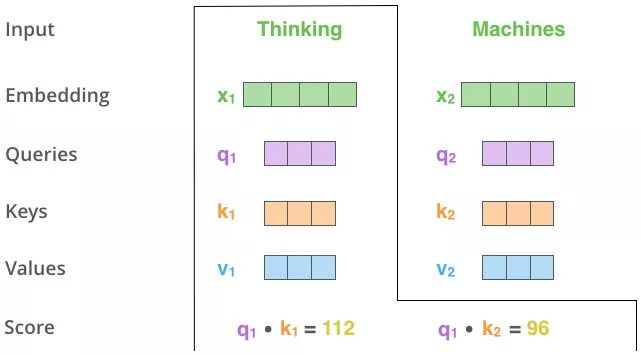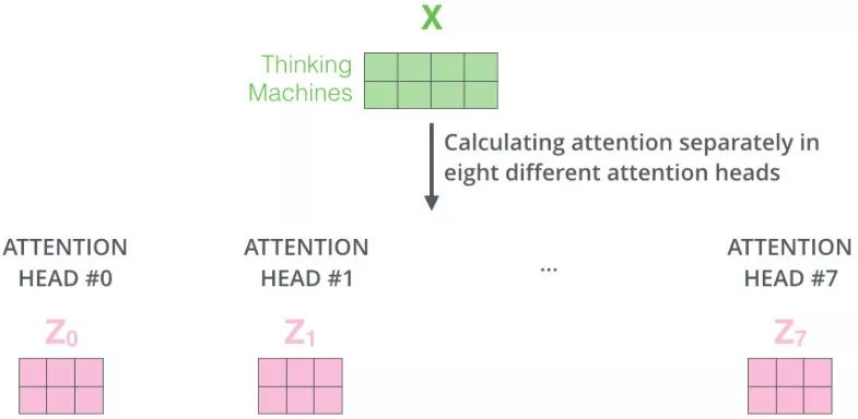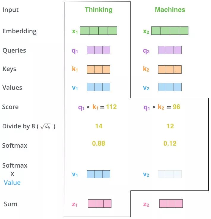 - 浅绿色向量 x1 表示单词 “Thinking” 的特征向量,其中 x1 经过 Self-Attention 层,变成浅粉色向量 z1;