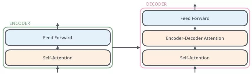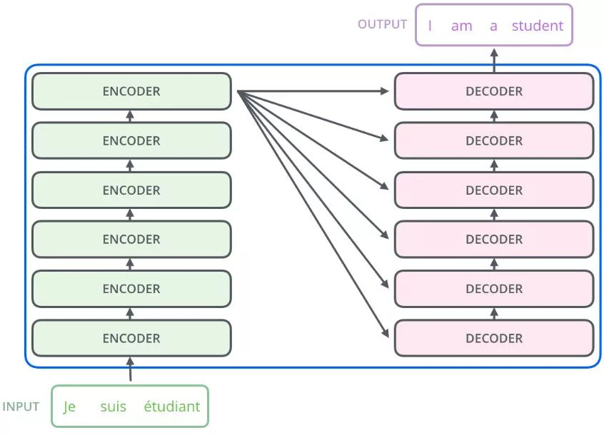 以上,就讲完了 Transformer 编码和解码两大模块,那么我们回归最初的问题,将 “机器学习” 翻译成 “machine learing”,解码器的输出是一个浮点型的向量,怎么转化成 “machine learing” 这两个词呢?让我们来看看 Encoders 和 Decoders 交互的过程寻找答案: