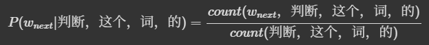 对于上一节提到的另外一个问题,当给定前面词的序列 “判断,这个,词,的” 时,想要知道下一个词是什么,可以直接计算如下概率: