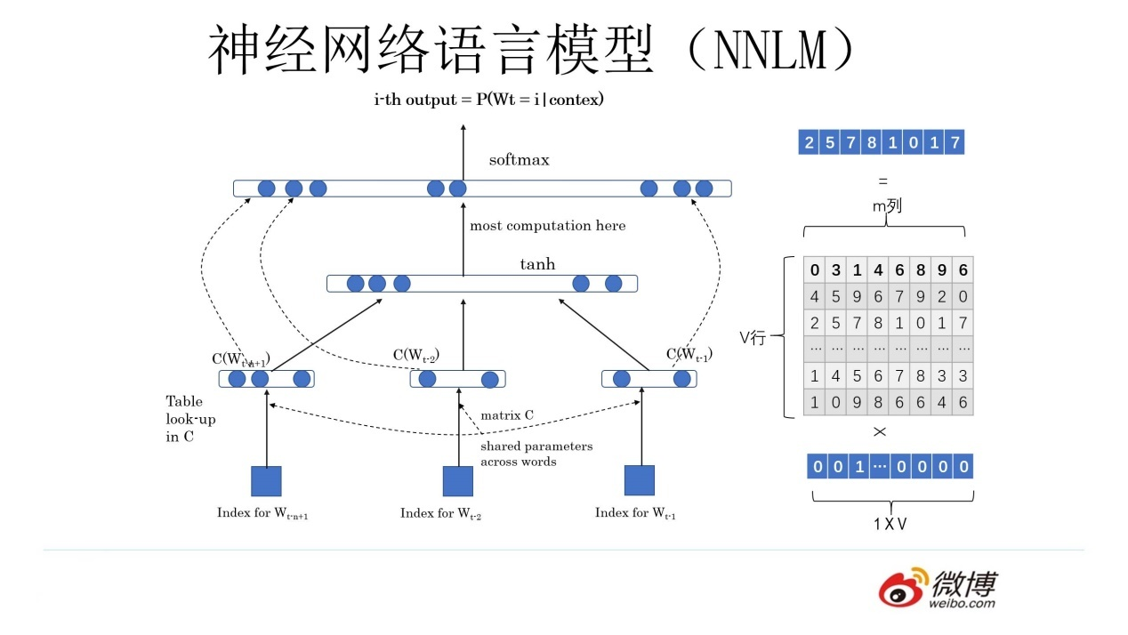 上图为神经网络语言模型结构图,它的学习任务是输入某个句中单词 wt=bert 前的 t−1 个单词,要求网络正确预测单词 “bert”,即最大化: