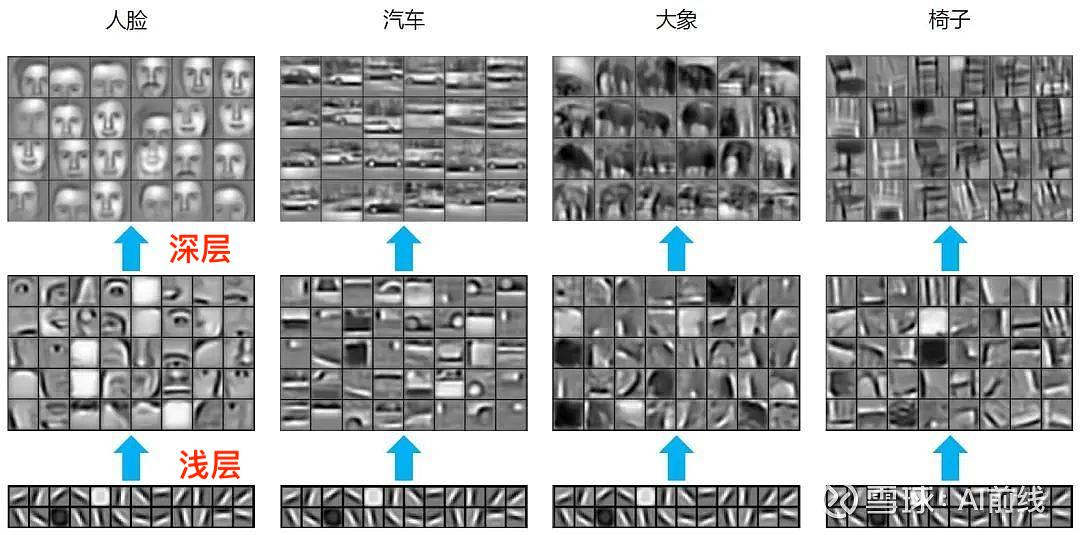卷积神经网络(CNN),CNN 一般用于图片分类任务,并且CNN 由多个层级结构组成,不同层学到的图像特征也不同,越浅的层学到的特征越通用,越深的层学到的特征和具体任务的关联性越强(人脸-人脸轮廓、汽车-汽车轮廓),如下图所示:
