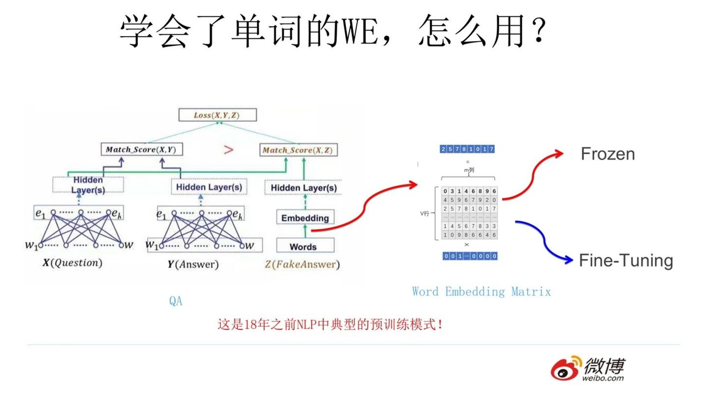 下游NLP任务在使用 Word Embedding 的时候也类似图像有两种做法,一种是 Frozen,就是 Word Embedding 那层网络参数固定不动;另外一种是 Fine-Tuning,就是 Word Embedding 这层参数使用新的训练集合训练也需要跟着训练过程更新掉。
