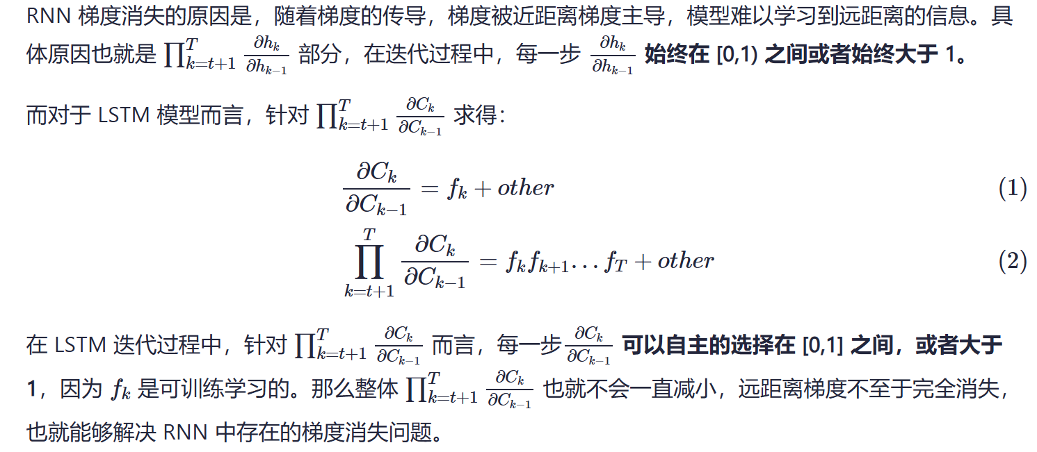 STM 遗忘门值 ft 可以选择在 [0,1] 之间,让 LSTM 来改善梯度消失的情况。也可以选择接近 1,让遗忘门饱和,此时远距离信息梯度不消失;也可以选择接近 0,此时模型是故意阻断梯度流,遗忘之前信息。