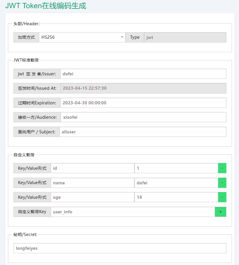 自定义载荷:可以添加任何的信息,一般添加用户的相关信息或其他业务需要的必要信息。但不建议添加敏感信息,因为该部分在客户端可解密。