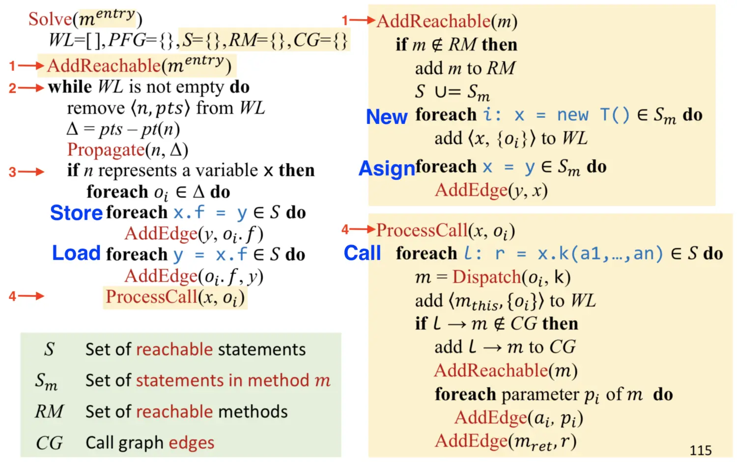 问题:由于指针分析和CG构造互相影响,所以每次迭代只分析可达的函数和语句。然后不断发现和分析新的可达函数。